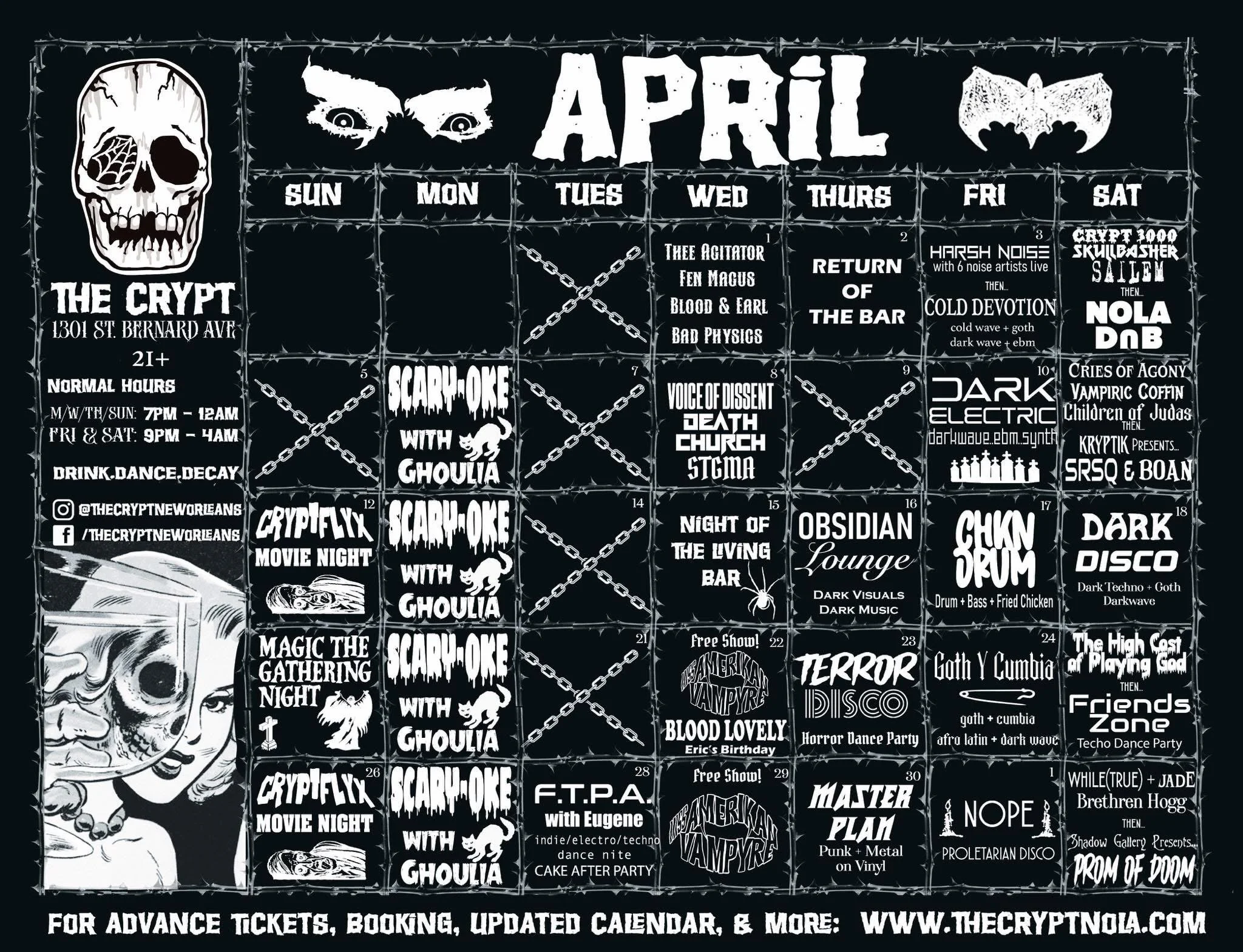 The Crypt is a goth and alternative-oriented venue & neighborhood bar at the intersection of New Orleans’ Seventh Ward, Marigny, and French Quarter.